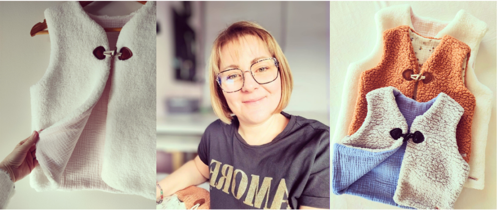 Chaque gilet est imaginé, découpé et cousu à la main par Mylène, dans son atelier en Moselle.